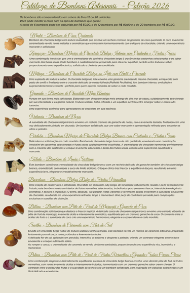 A caixa de 6 bombons pode ser adquirida por R$ 50,00, a de 12 bombons por R$ 90,00 e a de 20 bombons por R$ 150,00.